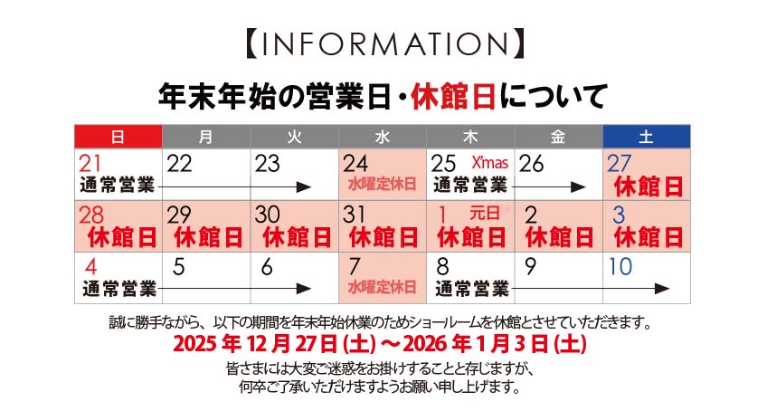 誠に勝手ながら、以下の期間を年末年始休業のためショールームを休館とさせていただきます。