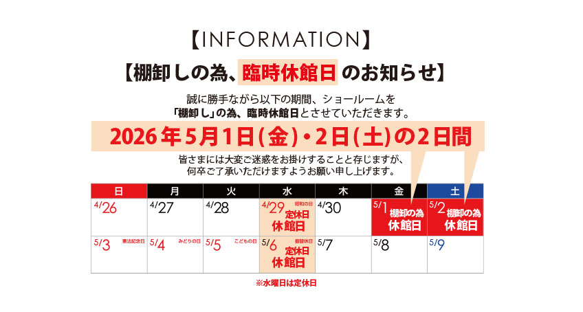 誠に勝手ながら2026年5月1日(金)・2日(土)の2日間、ショールームを「棚卸し」の為、臨時休館日とさせていただきます。