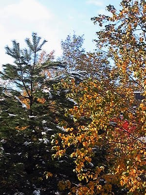 通勤途中に、まだ緑の葉っぱが半分残った木に雪が積もっているのを見ました。