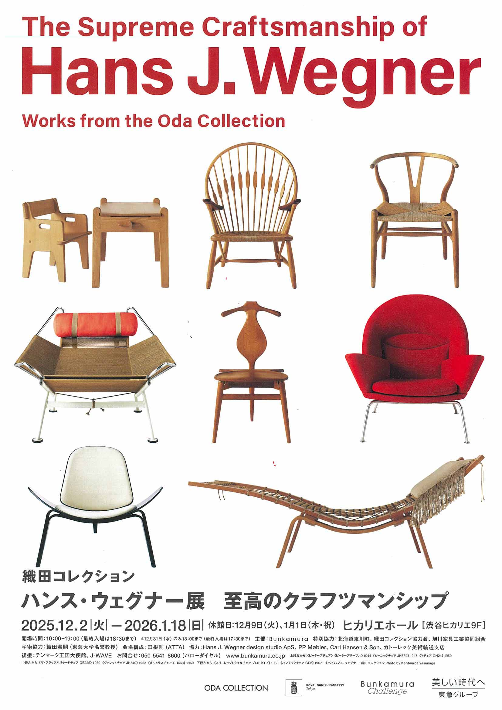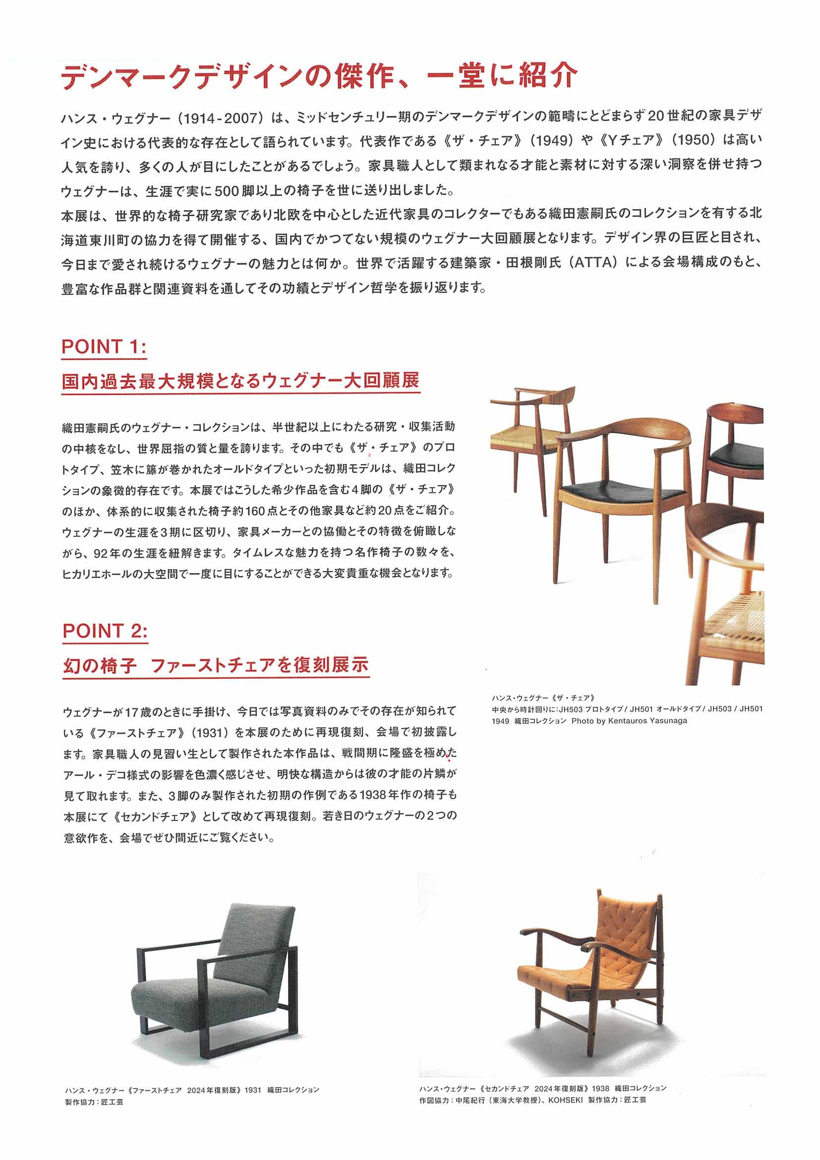 本展は、世界的な椅子研究家であり北欧を中心とした近代家具のコレクターでもある織田憲嗣氏のコレクションを有する北海道東川町の協力を得て、椅子約160点、その他家具などを一堂に集めた、国内でかつてない規模のウェグナー大回顧展となります。デザイン界の巨匠と目され、今日まで愛され続けるウェグナーの魅力とは何か。世界で活躍する建築家・田根剛氏(ATTA)による会場構成のもと、豊富な作品群と関連資料を通してその功績とデザイン哲学を振り返ります。