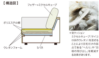 座クッションは積層させたウレタンが身体をしっかりと支え、背クッションは羽毛+ミクセルキューブを